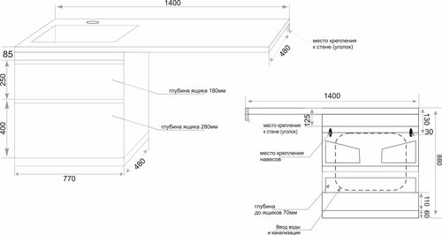 Встроенная раковина обладает гладкой поверхностью, легкой в уходе и приятной на ощупь. Тумба оснащена удобными выдвижными ящиками, которые обеспечивают удобное хранение различных предметов и аксессуаров для ванной.
