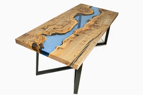 Столы из массива с эпоксидной смолой могут иметь различные формы, от классических прямоугольных до оригинальных изогнутых или волнообразных. Эпоксидная смола позволяет создавать удивительные эффекты, включая волны, облака, водопады и даже включения цветных пигментов, что делает каждый стол уникальным произведением искусства.