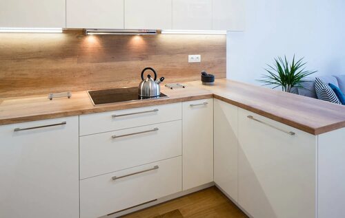 Белая кухня Сканди с деревянной столешницей и фартуком