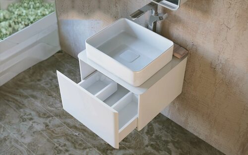 Тумба под раковину Raval Pure 56 подвесная белая выполнена из прочного и долговечного материала, который легко моется и устойчив к влаге. Ее компактные размеры и стильный дизайн делают ее идеальным выбором для небольших ванных комнат. Белый цвет тумбы придает ей свежий и современный вид, а подвесное исполнение обеспечивает легкость и визуальное пространство в помещении.