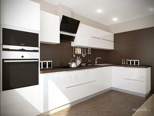 Белая кухня с шоколадной столешницей - это элегантное и современное решение для интерьера. Комбинация белого цвета с тёмной столешницей создаёт контрастный и стильный образ кухонного пространства.