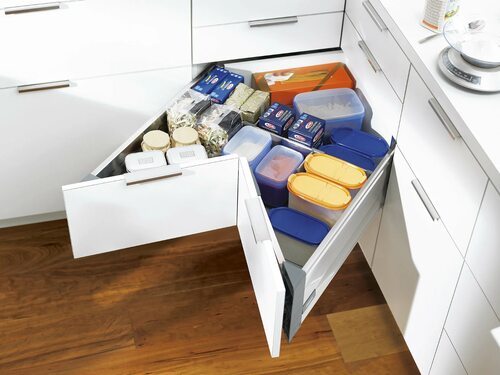 Угловой выдвижной ящик для кухни представляет собой функциональное решение для хранения посуды, кухонных принадлежностей и других предметов. Он позволяет оптимально использовать угловые пространства кухонных шкафов, обеспечивая удобный доступ к хранимым предметам.