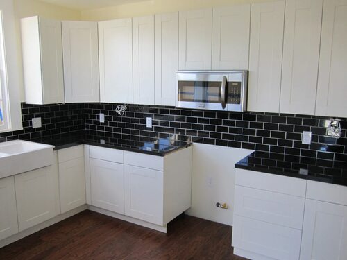 Белая кухня с черной столешницей и черной плиткой - это смелое и стильное решение для интерьера. Чистота белого цвета в сочетании с элегантностью черного создает уникальный и изысканный облик кухонного пространства.
