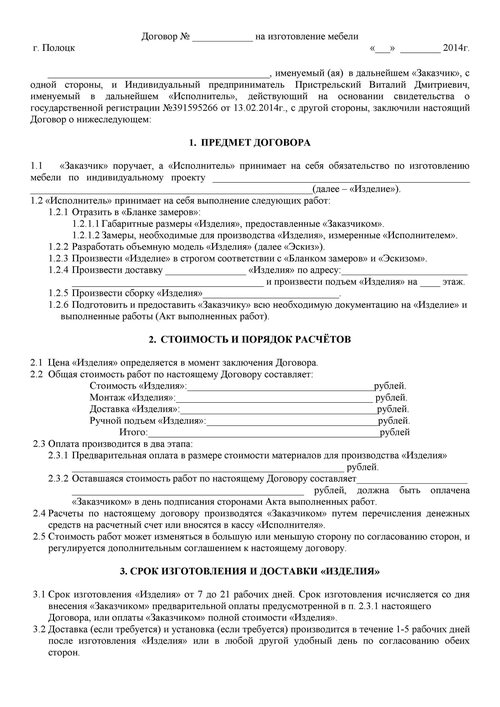 Договор на изготовление мебели между ИП Ивановым Иваном Ивановичем, именуемым в дальнейшем \"Изготовитель\", и г-ном Петровым Петром Петровичем, именуемым в дальнейшем \"Заказчик\", заключен на условиях и в порядке, указанных ниже.