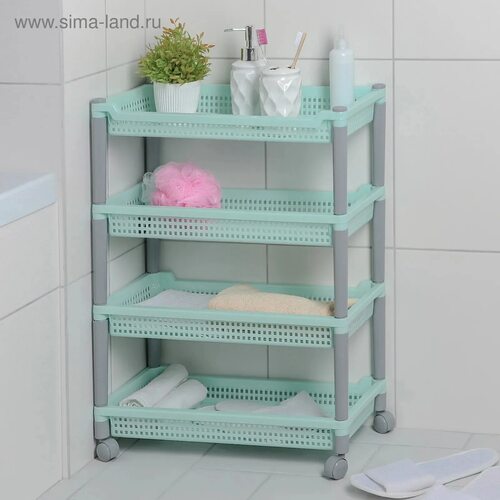 Этажерка имеет 4 секции, что обеспечивает достаточно места для размещения различных предметов. Колесики делают ее мобильной и легкой в уходе. Материал изготовления обеспечивает надежность и долговечность конструкции.