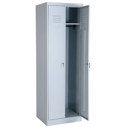 Шкаф изготовлен из высококачественного металла, что обеспечивает его прочность и долговечность. Он оснащен удобными отделениями и замками для безопасного хранения вещей.