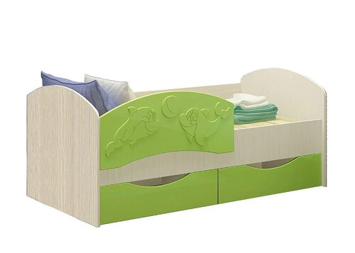 Бортик в форме дельфина обеспечивает безопасность ребенка во время сна, предотвращая падение. Два удобных ящика под кроватью позволяют хранить игрушки, постельное белье и другие вещи, экономя место в детской комнате.