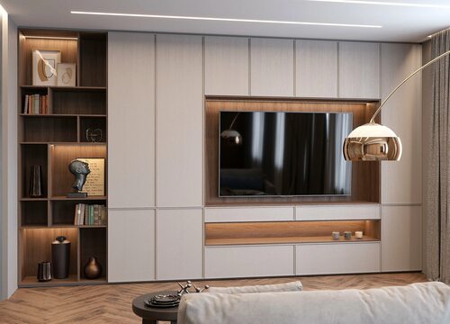 Благодаря наличию ниши под телевизор, вы сможете органично вписать его в интерьер, создав удобную зону для просмотра. Некоторые модели шкафов-купе также предусматривают возможность скрыть телевизор за специальной дверцей, что особенно актуально, если вы хотите сохранить минималистичный вид гостиной.