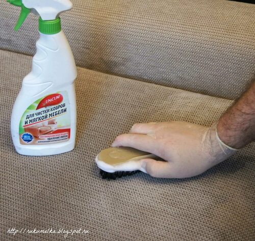 Фото 1: Пример применения специального средства для чистки дивана от детской мочи.