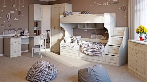 Двухъярусная кровать позволяет сэкономить место, освобождая пространство для игр и занятий. В комплект входят также шкафы, полки и другие элементы мебели, обеспечивающие удобство и функциональность использования.