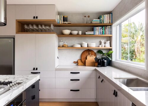 Идеи организации кухни с открытыми верхними полками