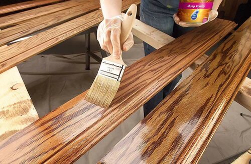 Выберите подходящую морилку для дерева и нанесите ее на стол при помощи кисти или тканевой салфетки. Равномерно распределите морилку по всей поверхности и дайте ей высохнуть согласно инструкции на упаковке.