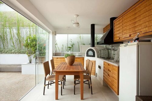 1. Открытая веранда с кухней, где кухонный уголок располагается на открытой террасе, а стол для приема пищи находится под навесом.