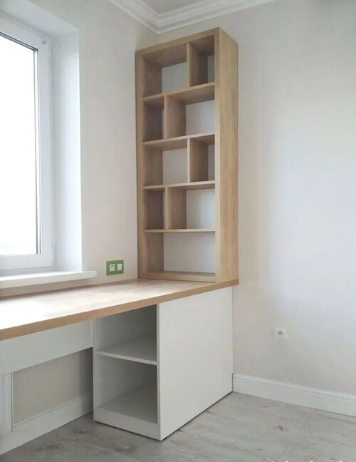 Существует множество вариантов оформления письменного стола у окна со стеллажами. Один из них - использование небольших подвесных стеллажей над столешницей для размещения книг, папок и различных аксессуаров. Это позволяет оптимально использовать пространство и держать рабочее место в порядке.