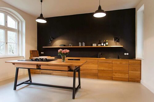 Для создания стильной кухни без навесных шкафов можно использовать различные дизайнерские приемы. Одним из них является использование подвесных полок из натурального дерева, которые добавят теплоты и уюта в интерьер.
