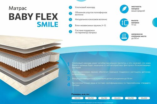 Матрас Бэби Флекс Смайл имеет ряд преимуществ, которые делают его идеальным выбором для детской кроватки. Он обладает удобной поверхностью, которая обеспечивает правильную поддержку позвоночнику малыша во время сна. Кроме того, матрас обладает антиаллергенными свойствами, что делает его безопасным для детей с чувствительной кожей или аллергиями.