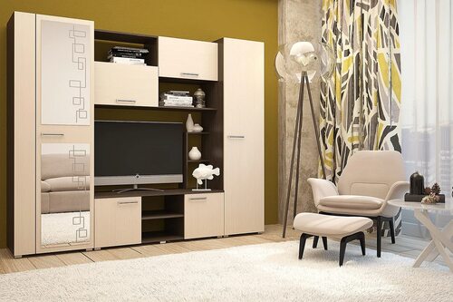 Стенка для гостиной Флора 2 - это элегантное и функциональное решение для обустройства гостиной комнаты. Она представляет собой комплекс мебели, включающий в себя тумбы, полки, шкафы и витрины, созданный в едином стиле и цветовой гамме.