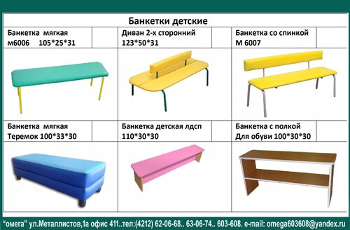 На рынке представлено множество различных моделей мягких банкеток, подходящих для использования в детских садах. Они могут отличаться по размерам, форме, цвету и материалам, из которых изготовлены.
