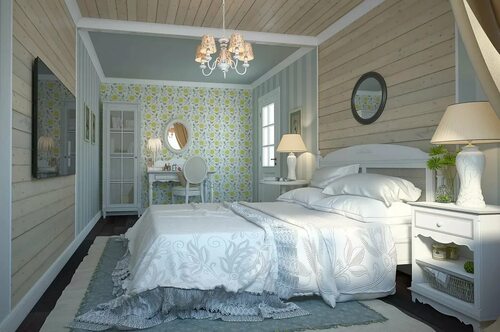 Интерьер спальни в стиле прованс с вагонкой предлагает прекрасное сочетание традиционного деревянного оформления с легкостью и непринужденностью провансальского стиля. Мягкие пастельные оттенки, натуральные материалы и уютные детали создают атмосферу спокойствия и гармонии, идеальную для отдыха и релаксации.