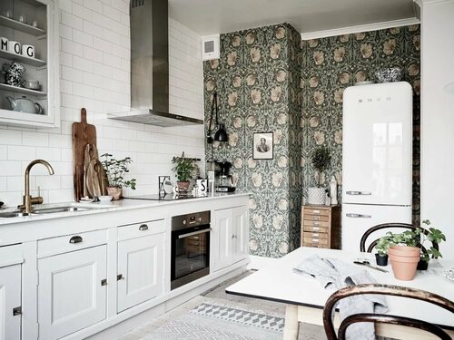2. Флористические мотивы. Обои с флористическими узорами в ретро стиле прекрасно впишутся в кухонный интерьер, придавая ему нежность и женственность.