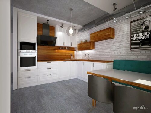 Кухня в стиле лофт предполагает использование простых материалов, таких как кирпич, металл и дерево. Белая отделка стен и мебели придает помещению светлую и просторную атмосферу, в то время как деревянные элементы добавляют тепла и уюта.