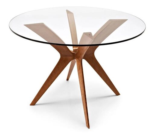 Круглый стеклянный стол на деревянных ножках - это элегантное и стильное решение для вашего интерьера. Он сочетает в себе прочность и изящество, придавая комнате легкость и простор. Этот стол может стать идеальным дополнением к любому современному или классическому интерьеру.