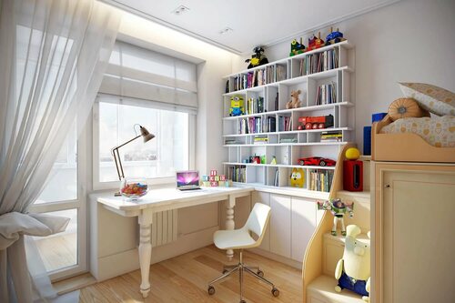 Рассмотрим несколько примеров расположения стола в детской комнате на фотографиях:
