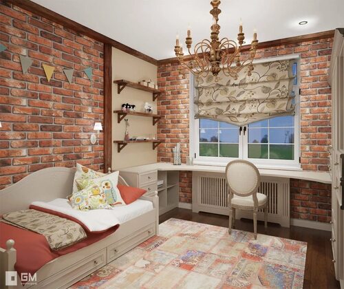 Фото 2: Интерьер детской с яркими обоями кирпичной кладки, добавляющими игривости и ярких акцентов в комнату.