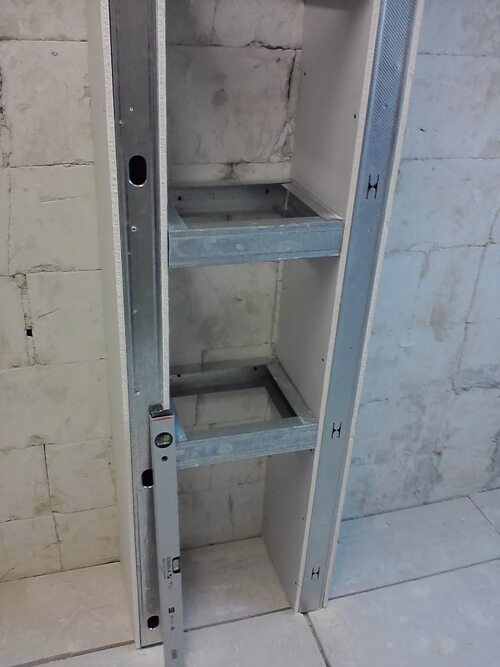 Сначала определите место, где вы хотите установить полки, и отметьте размеры короба. Затем вырежьте соответствующие куски гипсокартона и соберите короб с помощью деревянных брусков и шурупов. Убедитесь, что короб прочно закреплен к стене.