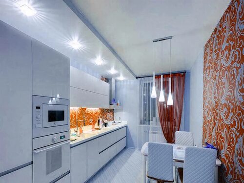 3. LED подсветка. Установка LED лент или светодиодных светильников позволяет создать эффектное подсвечивание нижней части натяжного потолка, что добавит кухне уют и оригинальность.