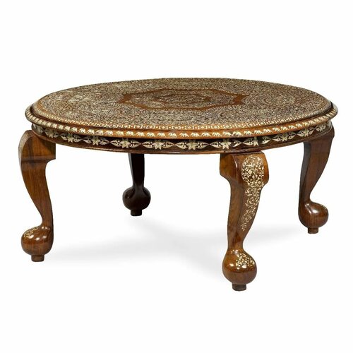 Столик кофейный из Индии, выполненный из латуни, представляет собой изысканное произведение мастерства. Этот предмет мебели сочетает в себе восточный колорит и изысканность исполнения.