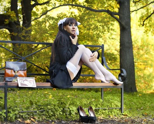 В чулках на лавочке в парке