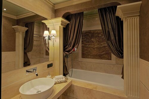 В греческом стиле интерьера ванной комнаты преобладают светлые оттенки, мраморные поверхности, колонны, узоры в виде геометрических фигур, а также изящные детали в виде статуй, ваз и амфор.