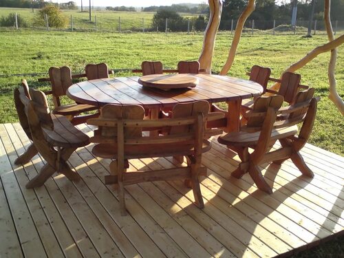 Стол выполнен из натурального дерева, что придает ему особый шарм. Его круглая форма и детали резьбы делают его уникальным элементом декора беседки.