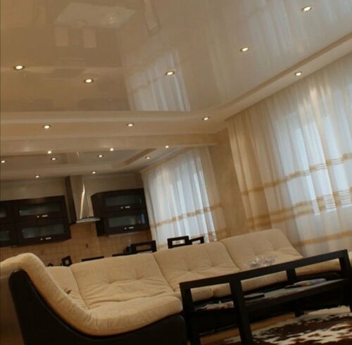 Одним из популярных вариантов дизайна натяжных потолков в больших комнатах является современный минимализм. Белые глянцевые потолки создают ощущение простора и света, а также отлично сочетаются с любым интерьером. Добавьте несколько встроенных светильников, и ваша комната преобразится.