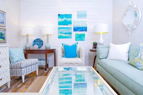 В гостиной белый и голубой могут использоваться для создания элегантного и стильного интерьера. Белые стены с голубыми декоративными элементами и текстилем придают помещению особый шарм.