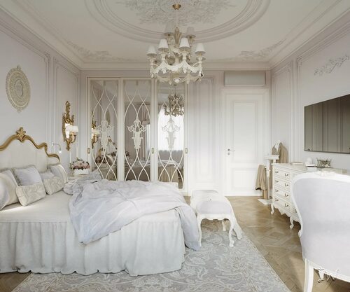 Используйте белые и светлые оттенки для стен, потолка и мебели. Добавьте классические элементы, такие как кристальные люстры, массивная деревянная мебель и мягкие текстильные аксессуары.