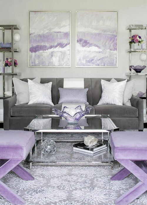 Лиловый и серый могут быть использованы в интерьере как основные цвета или как акцентные элементы. Например, можно использовать лиловые стены в спальне и дополнить их серыми шторами и подушками. Также можно создать контрастный эффект, используя серый диван и добавляя лиловые декоративные элементы.