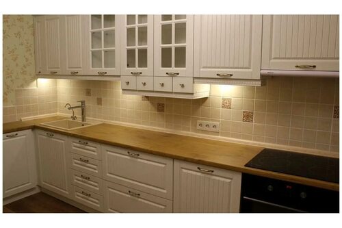 Фото 3: Пример дизайна кухни с дубовой столешницей и белыми фасадами