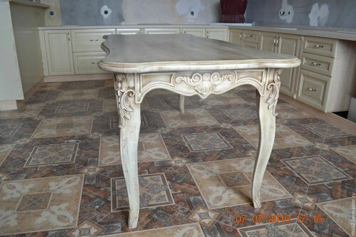 Резной узор на столешнице придает кухонному столу особый шарм и делает его уникальным. Белый цвет добавляет светлоты и воздушности в интерьер, делая кухню более просторной и уютной.