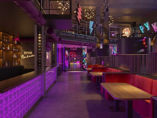 Интерьер бара \"Руки вверх\" представляет собой уникальное сочетание современного стиля и уютной атмосферы. Каждая деталь интерьера тщательно продумана и создана для комфорта посетителей.