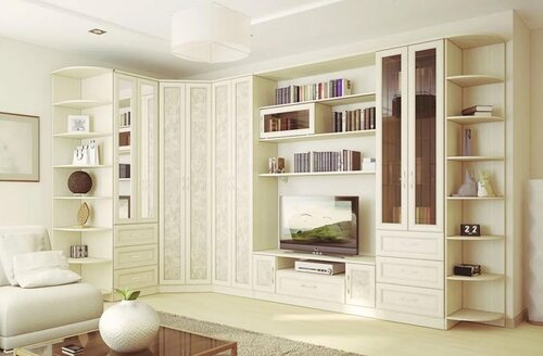 Белый цвет придает гостиной светлость и воздушность, делая ее более привлекательной для гостей и создавая уютную атмосферу для отдыха. Угловые стенки также позволяют оптимально использовать пространство, особенно в небольших помещениях. Они могут быть оборудованы полками, ящиками и другими функциональными элементами для хранения предметов интерьера и бытовых мелочей.