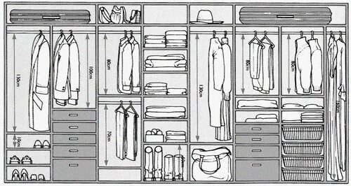 - Измерьте длину самых длинных предметов одежды и учтите этот параметр при выборе высоты полок.
