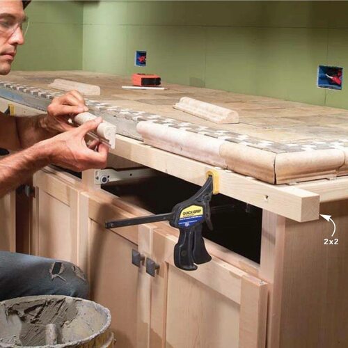 После укладки керамогранита завершите процесс, установив столешницу на своем месте. Подгоните размеры, при необходимости обработайте края и установите столешницу на кухне.