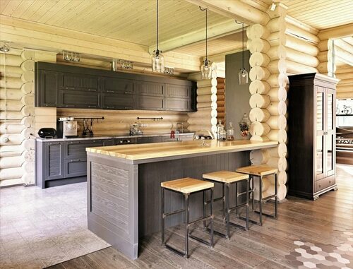 Ниже представлены фотографии различных кухонь в домах из бревна, выполненных в современном стиле. Используйте эти идеи для создания уникального дизайна вашей кухни.
