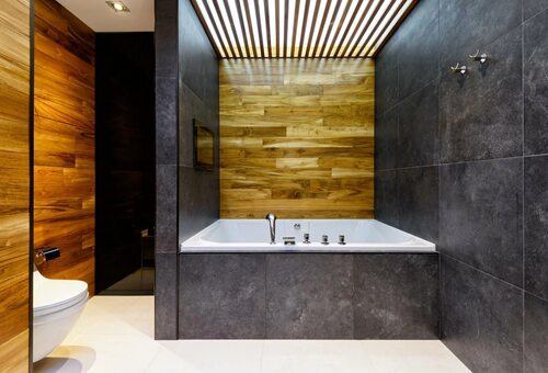 Натуральные текстуры дерева в сочетании с грубым бетоном создают уникальный эстетический эффект. Кроме того, такие материалы прекрасно сочетаются с современными сантехническими приборами и аксессуарами, что делает дизайн ванных комнат еще более привлекательным.