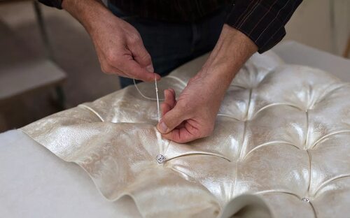 Обтяжка кровати кожей без каретной стяжки с поролоном