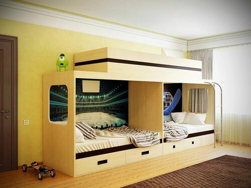 Существует множество разнообразных моделей двухъярусных кроватей, предназначенных для троих детей, где двое спят на нижней кровати. Они могут быть выполнены из различных материалов, иметь разные размеры и дополнительные функции. На фотографиях ниже представлены некоторые из популярных вариантов, которые могут послужить вдохновением для решения дизайнерских задач в детской комнате.