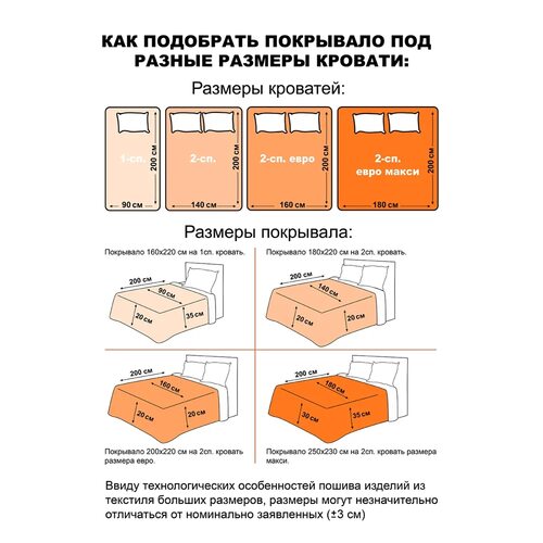 В зависимости от региона и производителя, размеры покрывал могут немного различаться, поэтому перед покупкой стоит измерить свою кровать и уточнить размеры у продавца.
