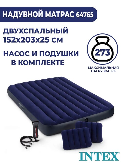 Матрас надувной Intex 152х203х25 +2 подушки+насос